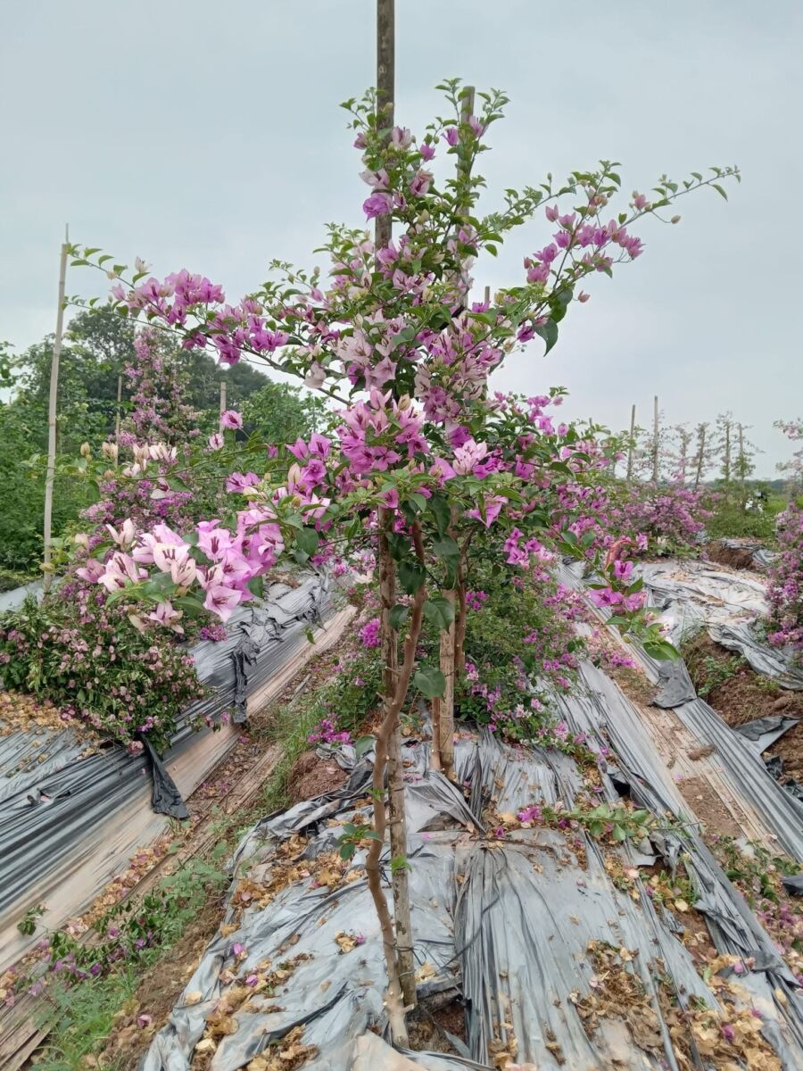 Cây Hoa Giấy Tím Tuyết Leo (tên khoa học: Bougainvillea spectabilis hoặc Bougainvillea glabra với biến thể màu tím tuyết), là một trong những loài hoa giấy được yêu thích nhất nhờ khả sắc hoa tím phớt trắng độc đáo, tạo nên một vẻ đẹp lãng mạn và bay bổng. Với khả năng leo giàn tốt và chiều cao lý tưởng từ 1.5m – 2m, loại hoa giấy này là lựa chọn hoàn hảo để trang trí cổng vòm, hàng rào, giàn leo hay bất kỳ không gian nào cần điểm nhấn rực rỡ và thơ mộng.